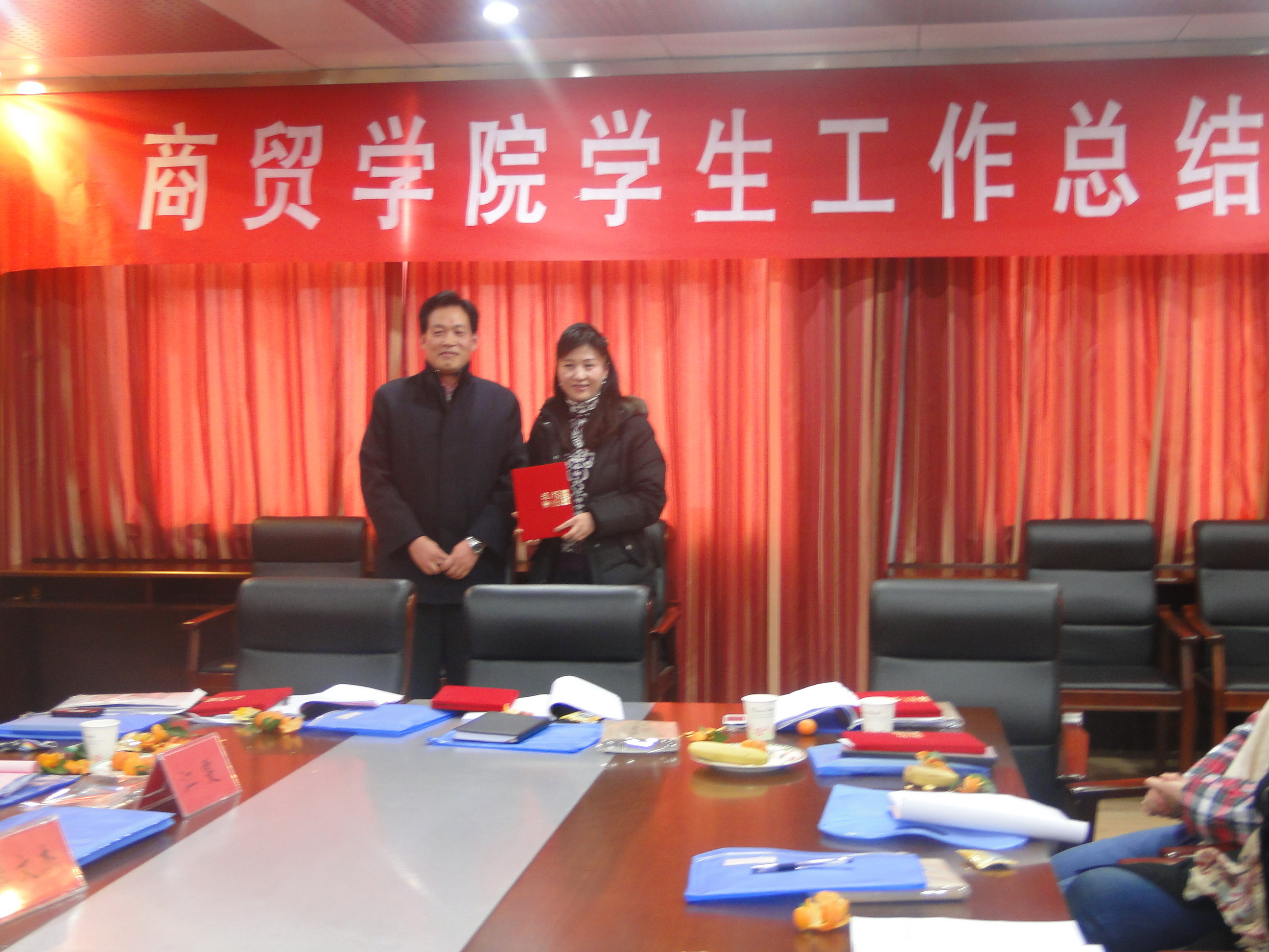 商贸公司夏欢书记宣读了2009—2010学年度员工工作表彰名单,刘李军老师获得学年度“优秀员工管理工作者”荣誉称号,陈建华、刘丹老师获得学年度“优秀辅导员”荣誉称号,罗俊杰、刘念、程媛英老师被评为学年度“就业工作先进个人”的荣誉称号。公司党委副书记徐俊才、公司副经理王辉华、学工处副处长李如岚、商贸公司经理胡天然、商贸公司书记夏欢以及公司团委江文老师为获奖老师颁奖。