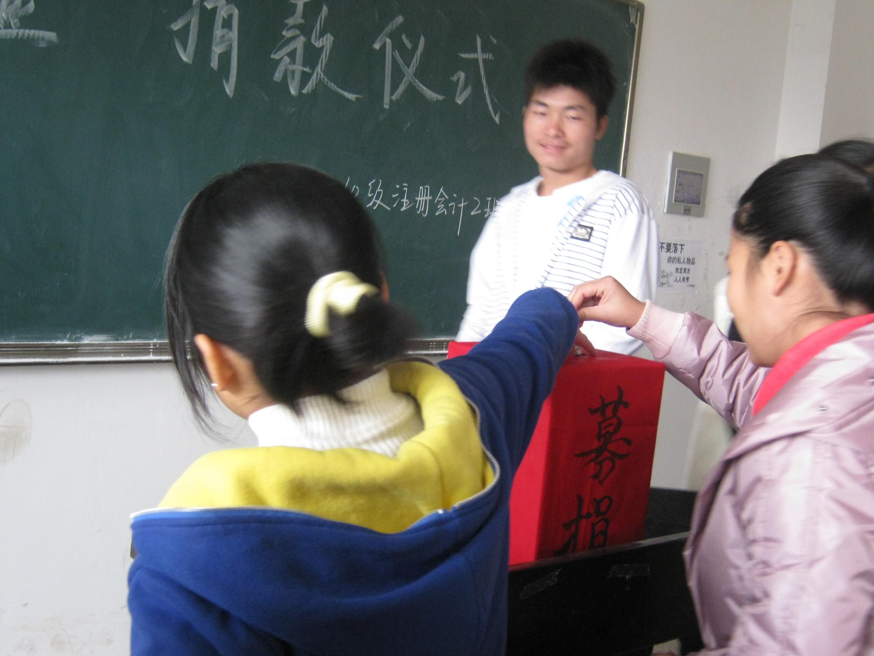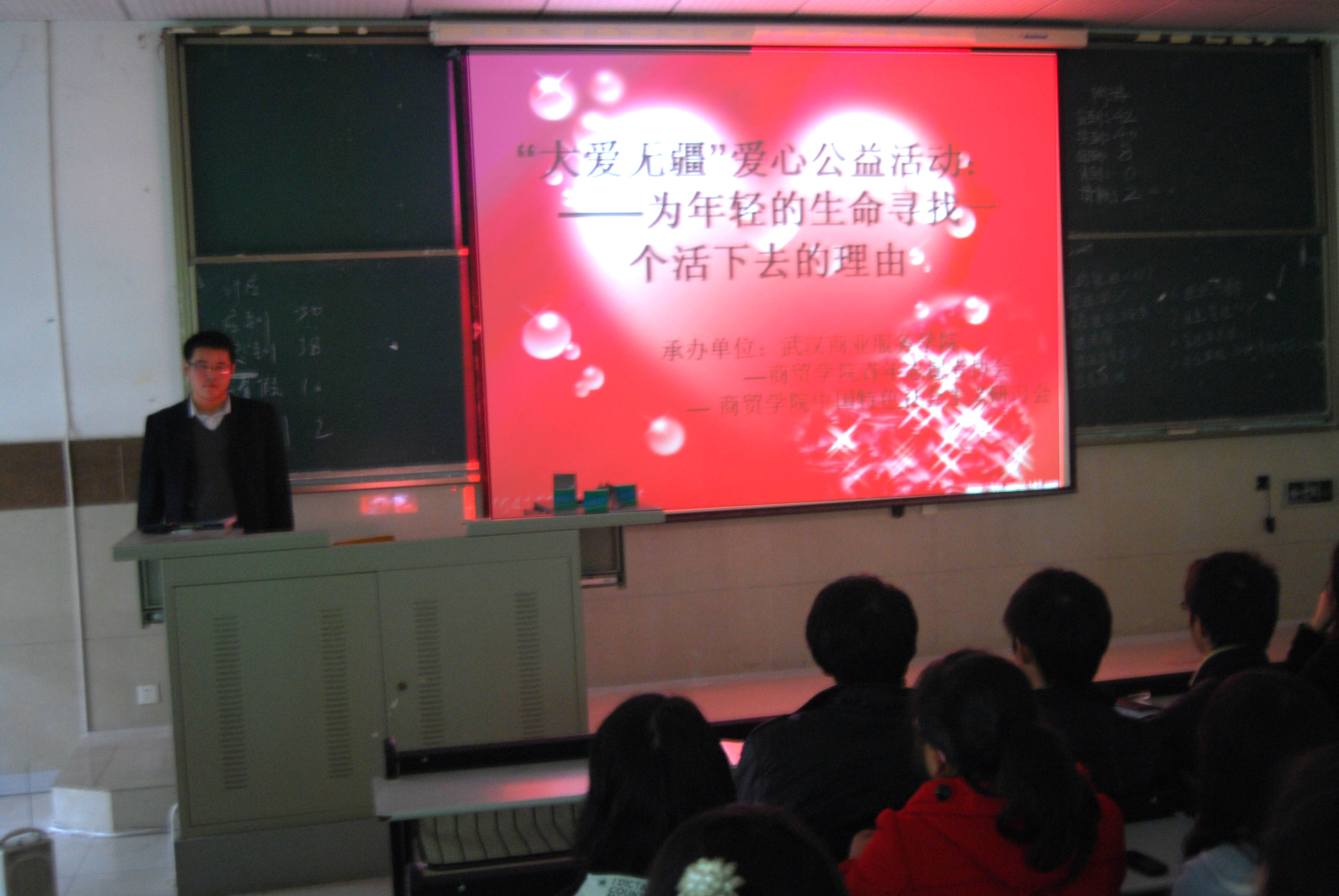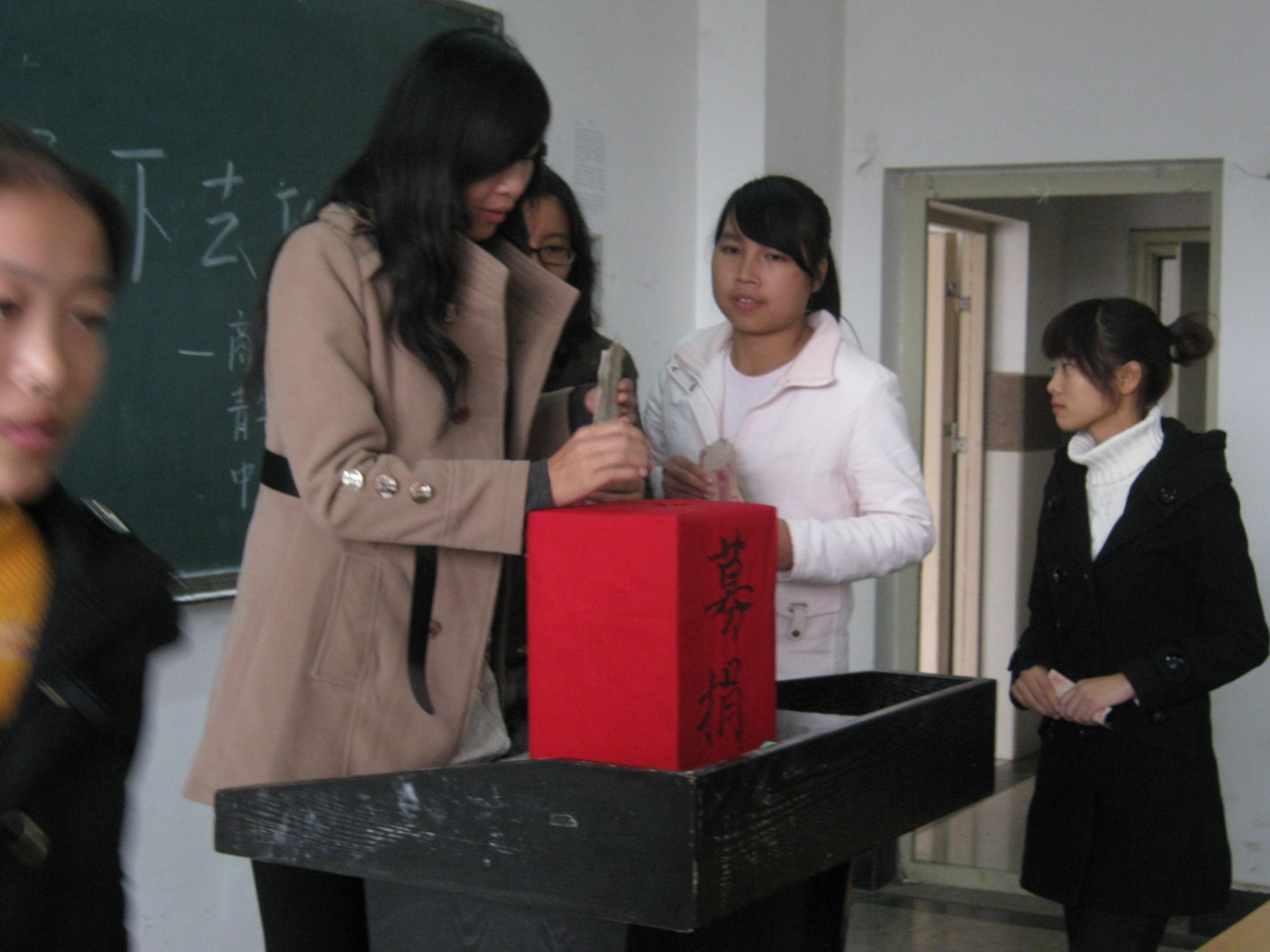 2010年11月15日中午12点45商贸公司青年志愿者协会和特研会在南区投6组织大一、大二所有副班长、团支书以及心理委员针对此次爱心倡议活动做了一次宣讲,其中包括主持人对杨铭权病情的介绍、播放湖北卫视《新闻一线》对杨铭权事件报道的相关视频、主人翁杨铭权的高中同学的具体讲解及呼吁,同时在每个班发放了一份《大爱无疆爱心倡议书》,请各个班委在本班级进行宣传并组织同学募捐。11月17日中午12点40分,青协和特研会组织各班团支书和10级注会2班的同学分别在北综教学楼109和105两个教室举行了募捐仪式,现场同学积极热情,踊跃捐款。11月18日上午湖北卫视《新闻一线》栏目来公司针对本活动采访了相关发起人及承办人,下午负责人将所有募捐金额汇款到患者杨铭权的银行账户中并致电送去公司员工的关心与祝福。