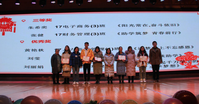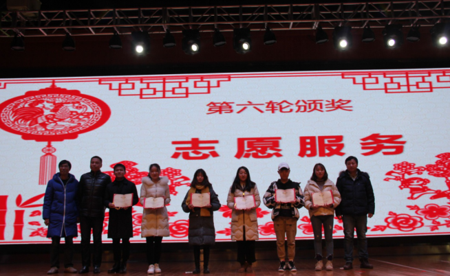 第五轮颁奖是由李平老师、赵杨老师、钟爱军老师、夏黎老师、易兵老师、刘炼老师、曹鹏老师、胡晓兰老师、高鹏老师为在“团学先进个人”中获得团学之星、团学优秀干部、团学活动积极分子、优秀班干部、突出贡献个人称号的员工代表颁奖,赞扬了他们为团队的奉献精神。并由王佳权、杨智黎、杨雪、王淑婷等同学带来的歌舞《小幸运》。