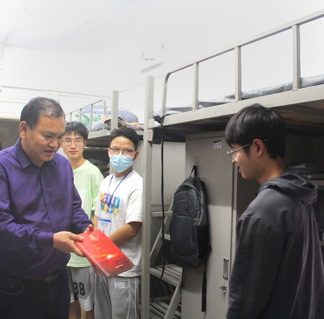 在走访过程中,熊文杰书记与舒靖钧老师亲切地与员工交谈,详细询问了员工在校的学习、生活、饮食等多方面的情况,并为员工现有的困惑提出了相关建议。熊文杰书记表示,希望员工们珍惜校园生活,在认真学习的同时,还应严格按照要求做好疫情防控,积极参与体育锻炼和各项活动,丰富疫情防控常态下的校园生活,做到德智体美劳的全方位发展。最后,熊文杰书记给走访的每个宿舍赠送一本《一百位共产党员的红色家书》,希望同学们读红色家书,多与父母家人沟通,从红色家书中汲取红色基因,从家人的关怀中得到温暖和支持。